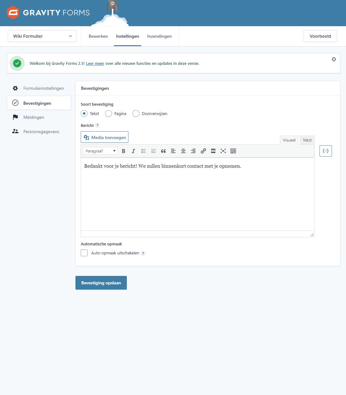 Een Bevestiging is het bericht dat getoond wordt, direct na het invullen. Dit kan in de vorm van een tekst, pagina of doorverwijzing.