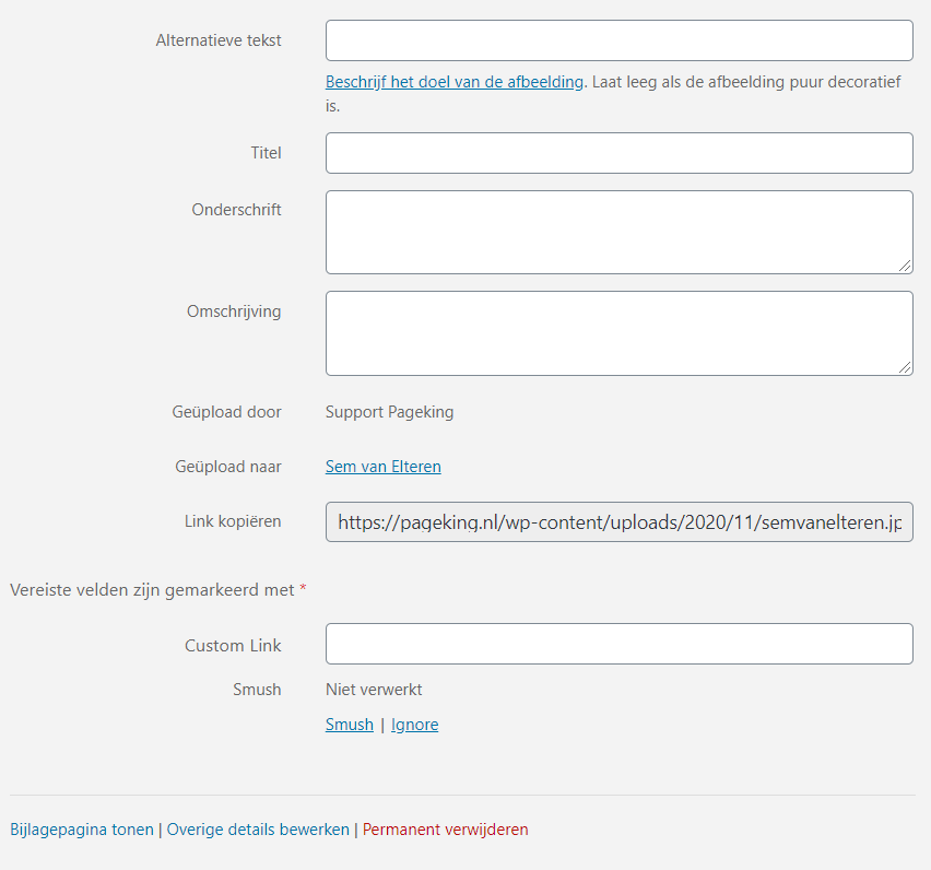 In de mediabibliotheek kun je de afbeelding, video of het bestand openen door erop te drukken. Je krijgt de foto in het groot te zien en aan de rechterkant zie je een aantal invulvelden staan.